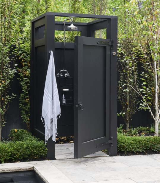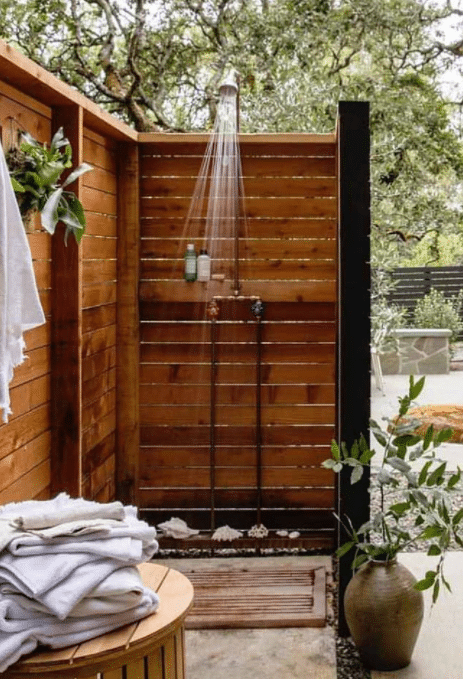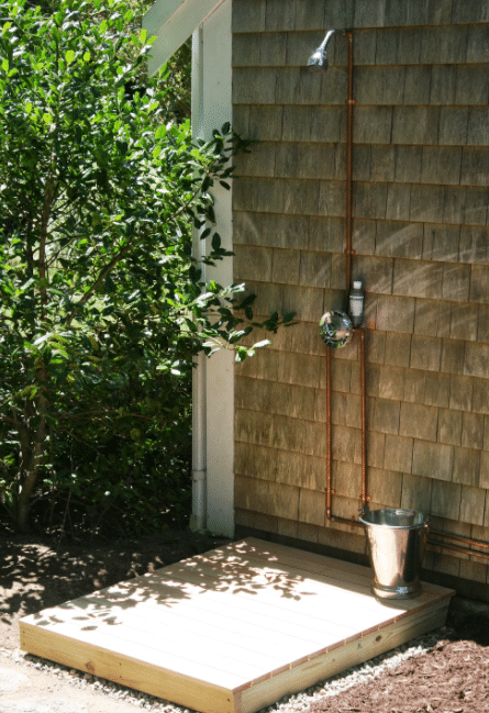 If you have access to water and a sewer line, you can install an outdoor shower using a standard showerhead and hose if you have access to water and a sewer line. If you don’t have access to water and sewer lines, you can install an outdoor shower using a gravity-fed system. With this type of system, you will need to install a tank above or near the to supply the water.